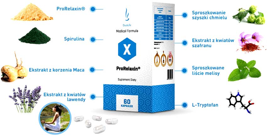 "Dzięki harmonijnemu zestawieniu biologicznie czynnych substancji pochodzących wyłącznie z naturalnych upraw i doposażonych o unikatową formułę, suplement diety ProRelaxin pozwala w skuteczny sposób wzmocnić układ nerwowy jednocześnie eliminując stan zmęczenia umysłowego."