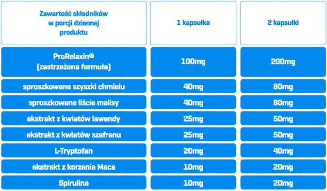 Składniki: inulina z korzenia cykorii podróżnika (FOS), zastrzeżona formuła ProRelaxin? z owoców pomarańczy chińskiej (Citrus sinensis), sproszkowane szyszki chmielu (Humulus lupulus), sproszkowane liście melisy (Melissa officinalis), ekstrakt z kwiatów lawendy (Lavandula angustifolia) 5:1, ekstrakt z kwiatów szafranu (Crocus sativus) 5:1, L-tryptofan, ekstrakt z korzenia maca (Lepidium meyenii) 4:1, spirulina. Składniki otoczki: organiczna pochodna celulozy (HPMC), guma gellan, kompleksy miedziowe chlorofili i chlorofilin (barwnik). Substancja przeciwzbrylająca: krzemionka.